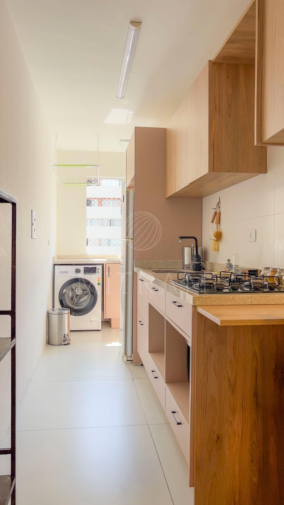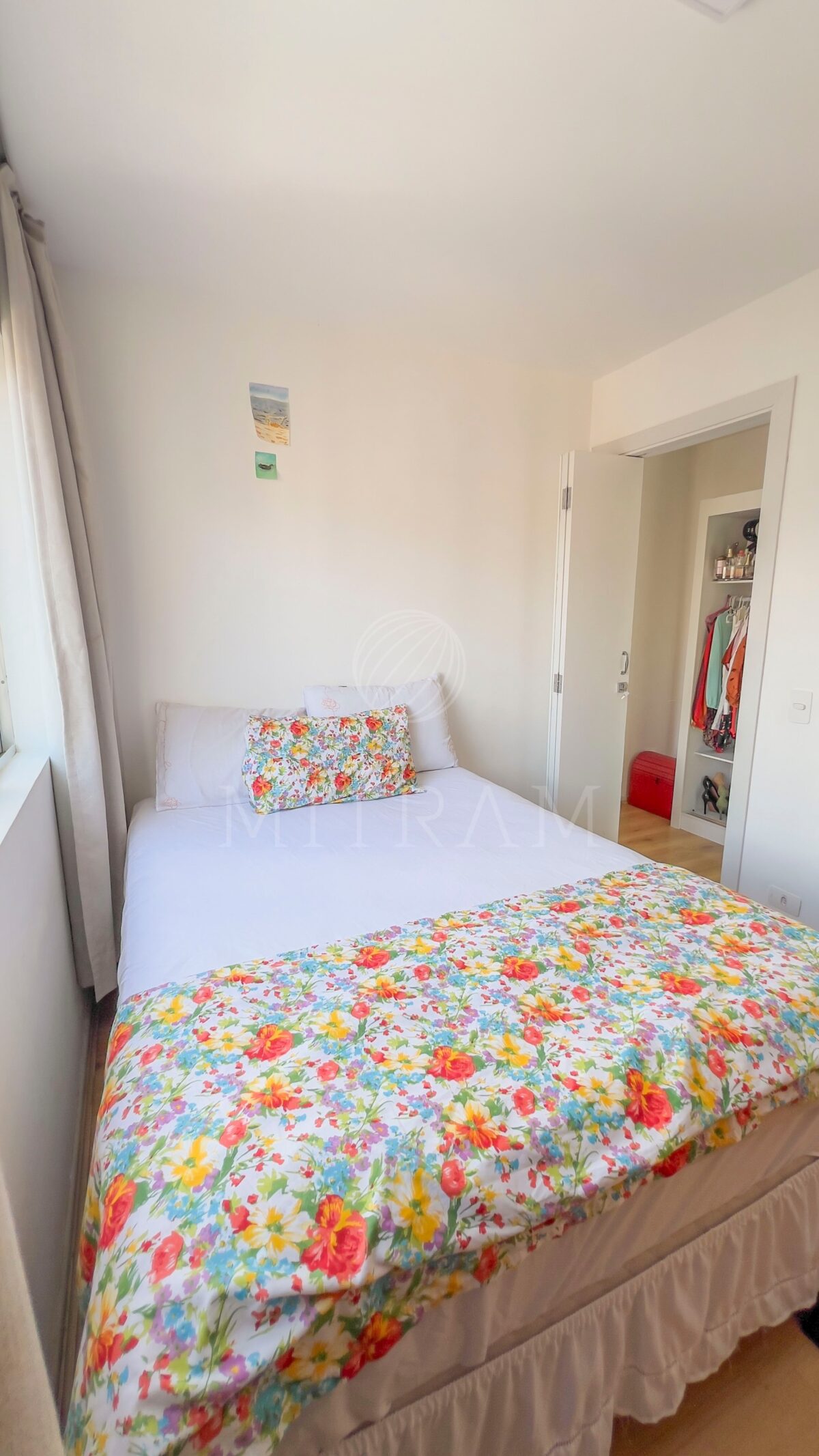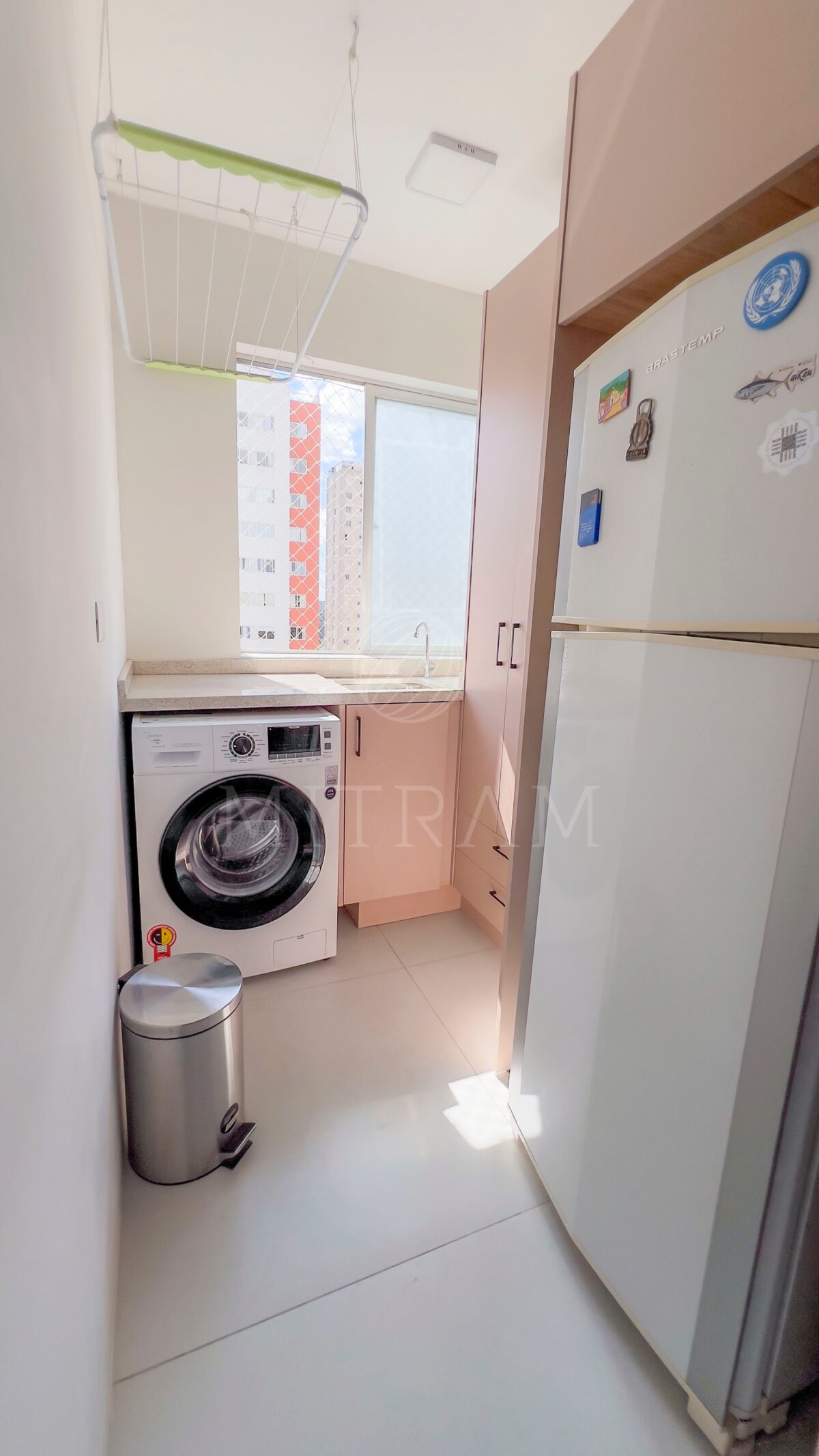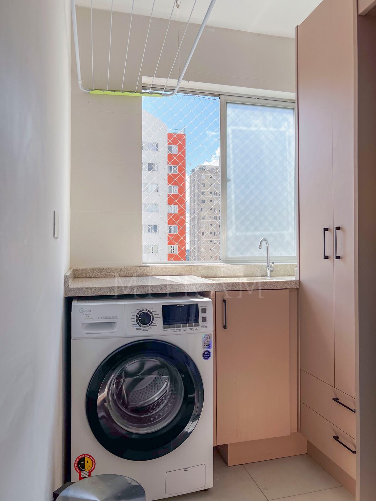 Apartamento de 45m² privativos com um quarto, banheiro com ventilação natural, sala, cozinha planejada e lavanderia. Não possui vaga de garagem.