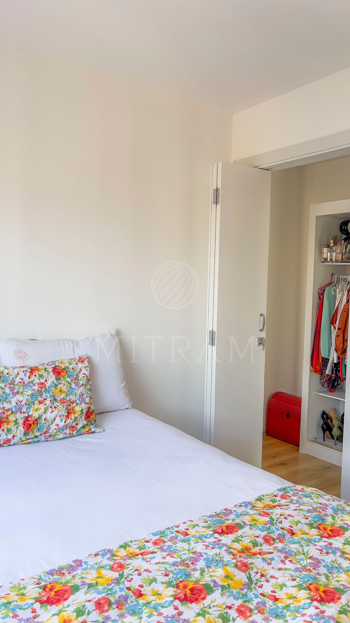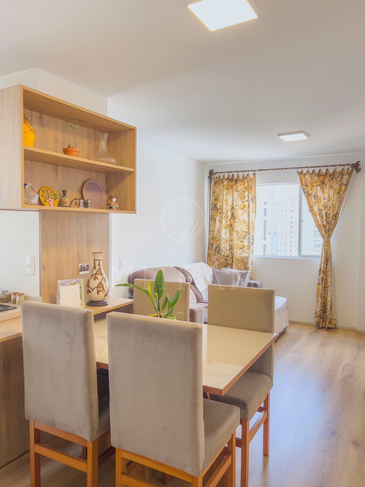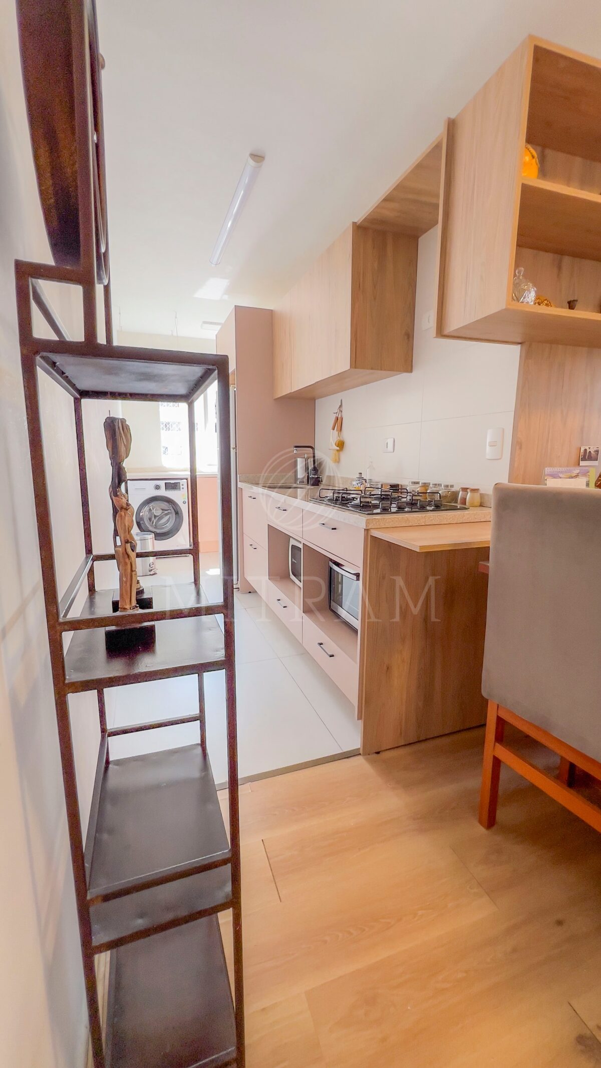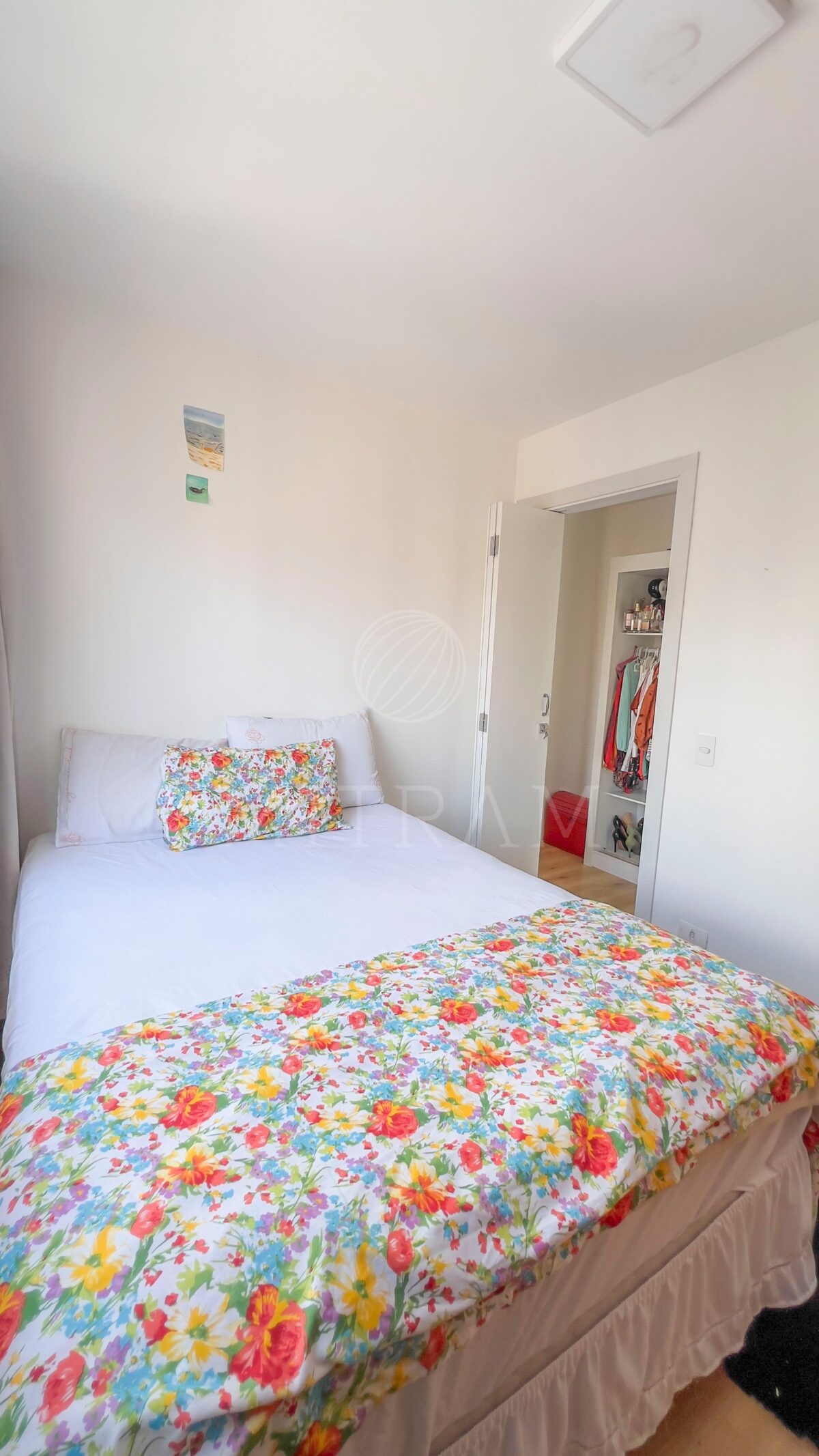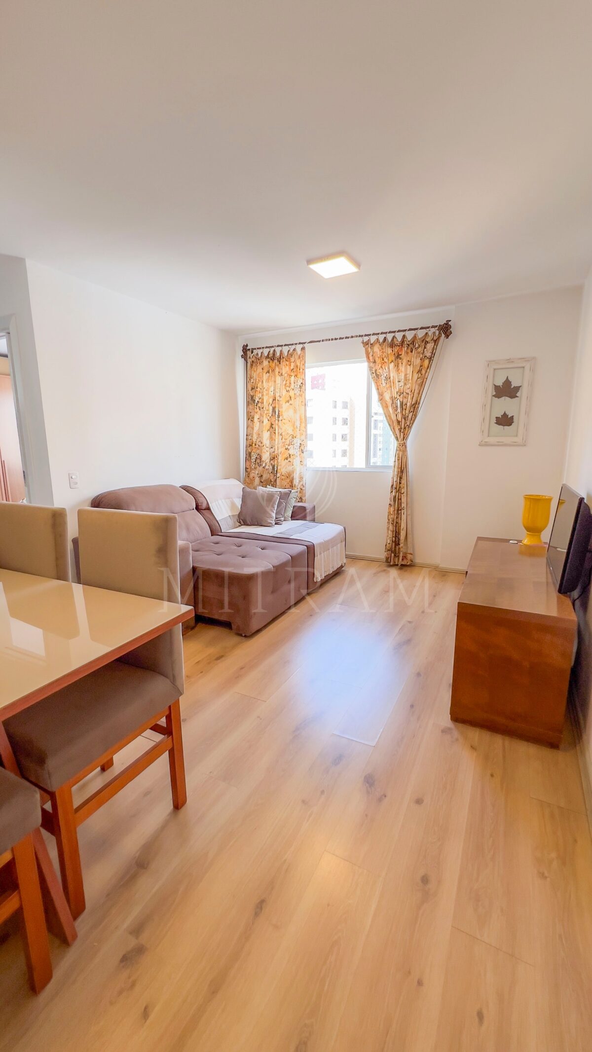 Apartamento de 45m² privativos com um quarto, banheiro com ventilação natural, sala, cozinha planejada e lavanderia. Não possui vaga de garagem.