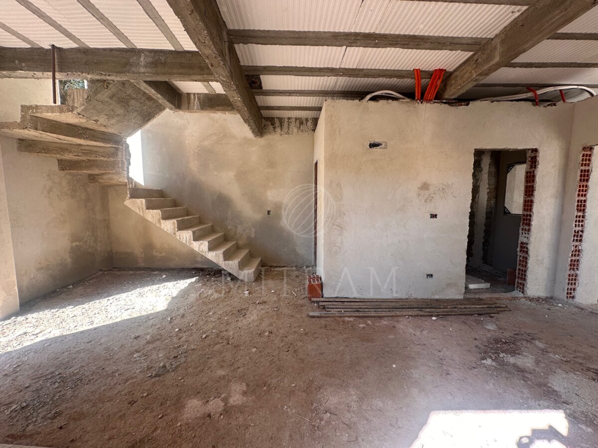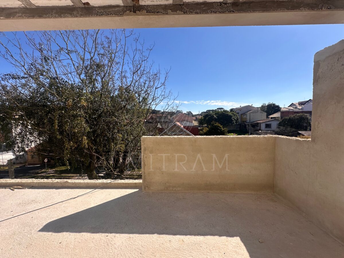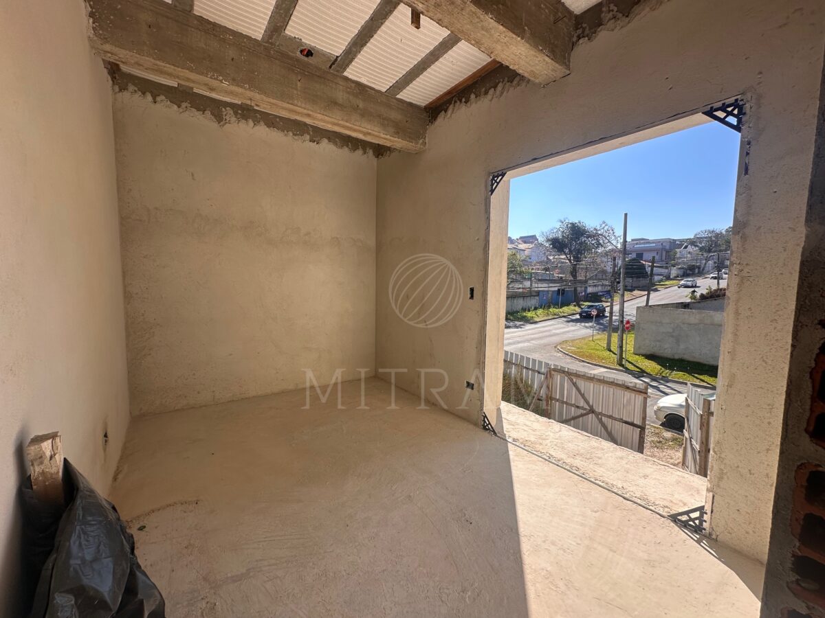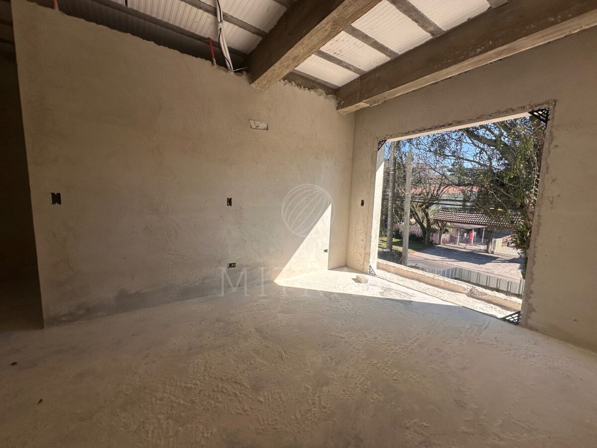 Sobrado em obra com 165m² e entrega prevista para dezembro. Garagem coberta, sala, cozinha, lavabo, churrasqueira e quintal no térreo.