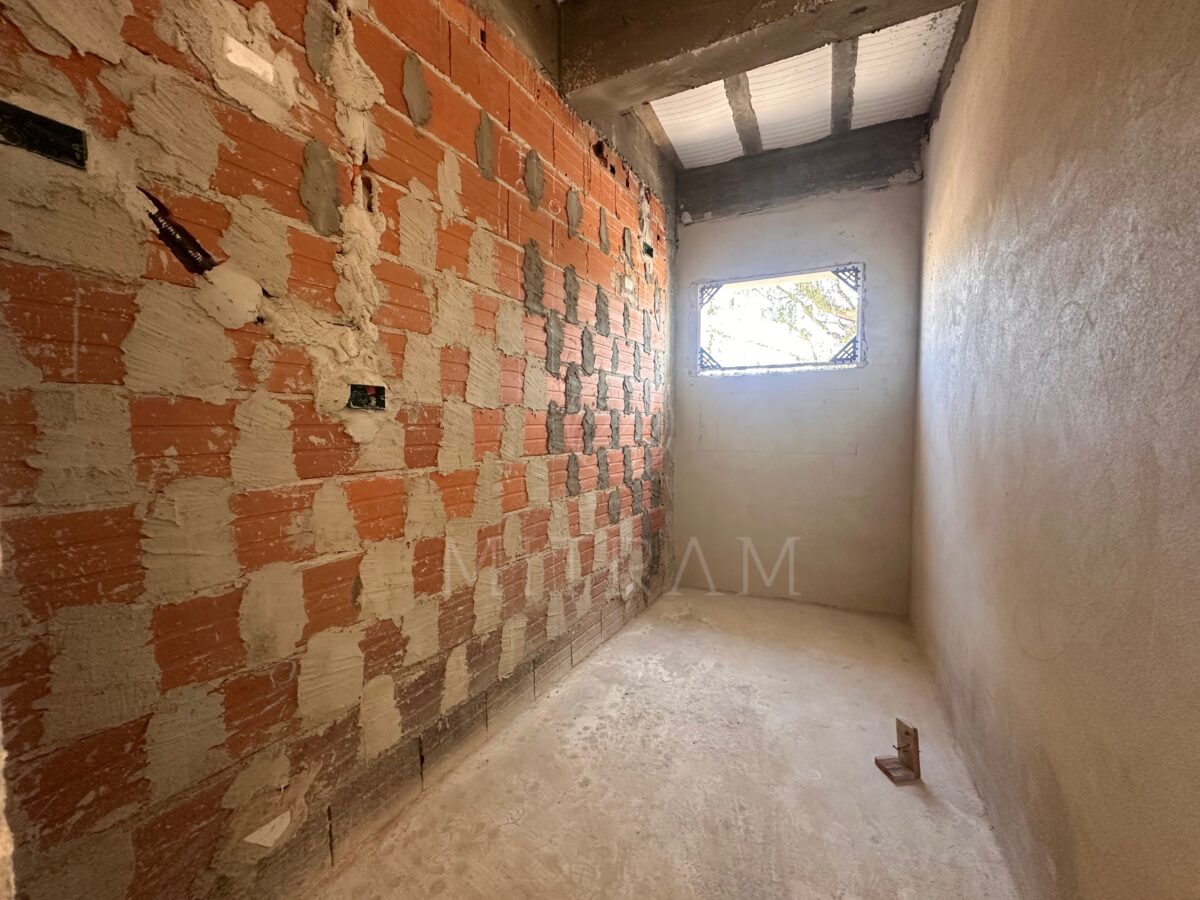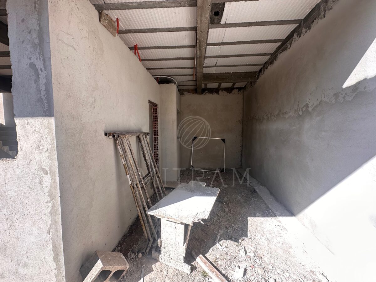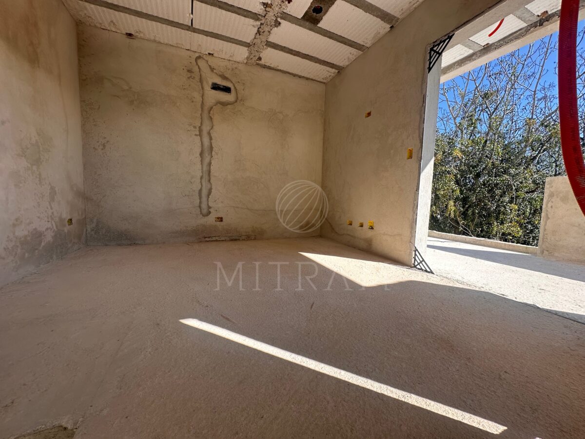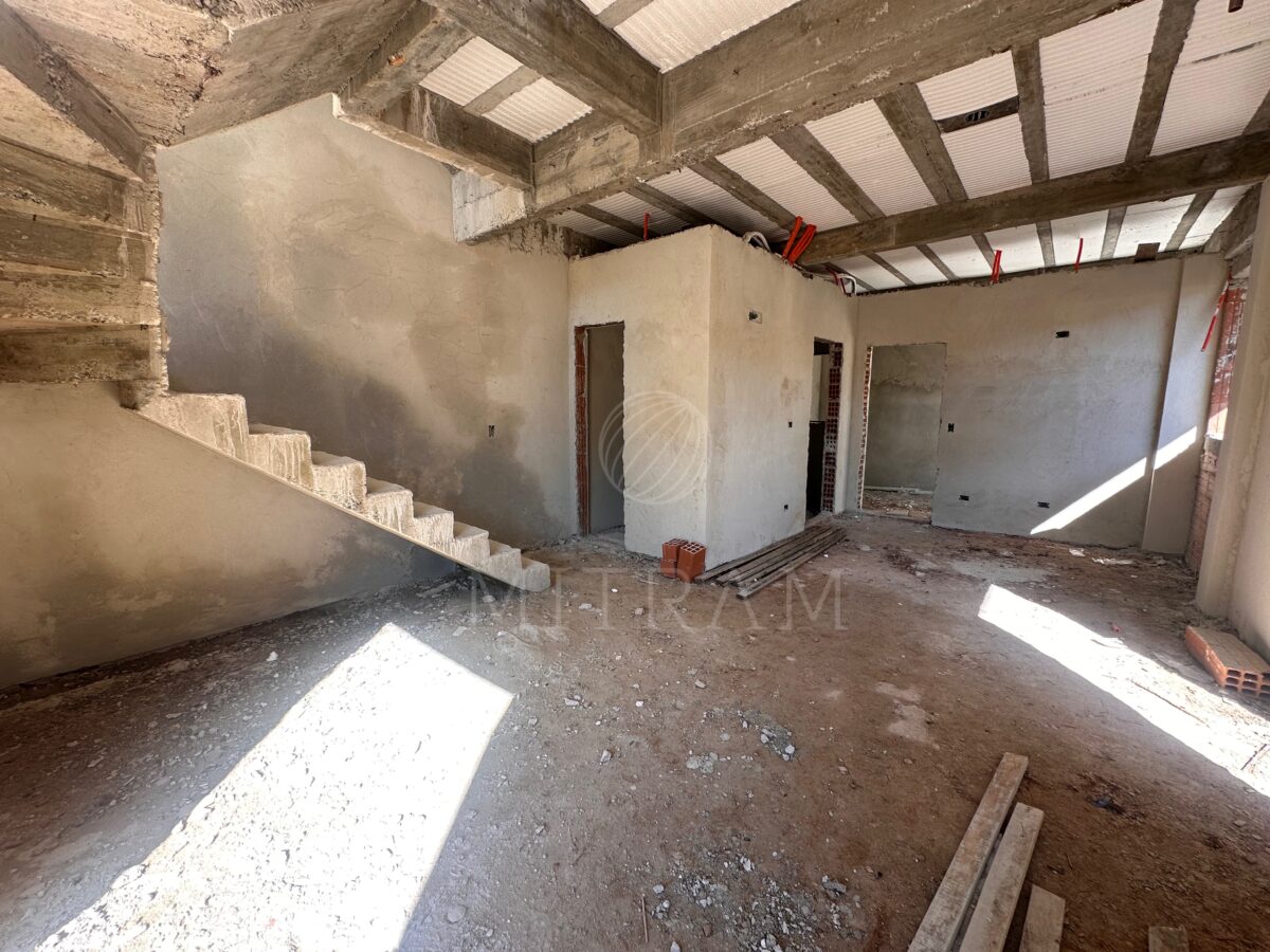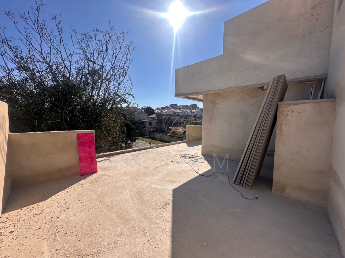 Sobrado em obra com 165m² e entrega prevista para dezembro. Garagem coberta, sala, cozinha, lavabo, churrasqueira e quintal no térreo.